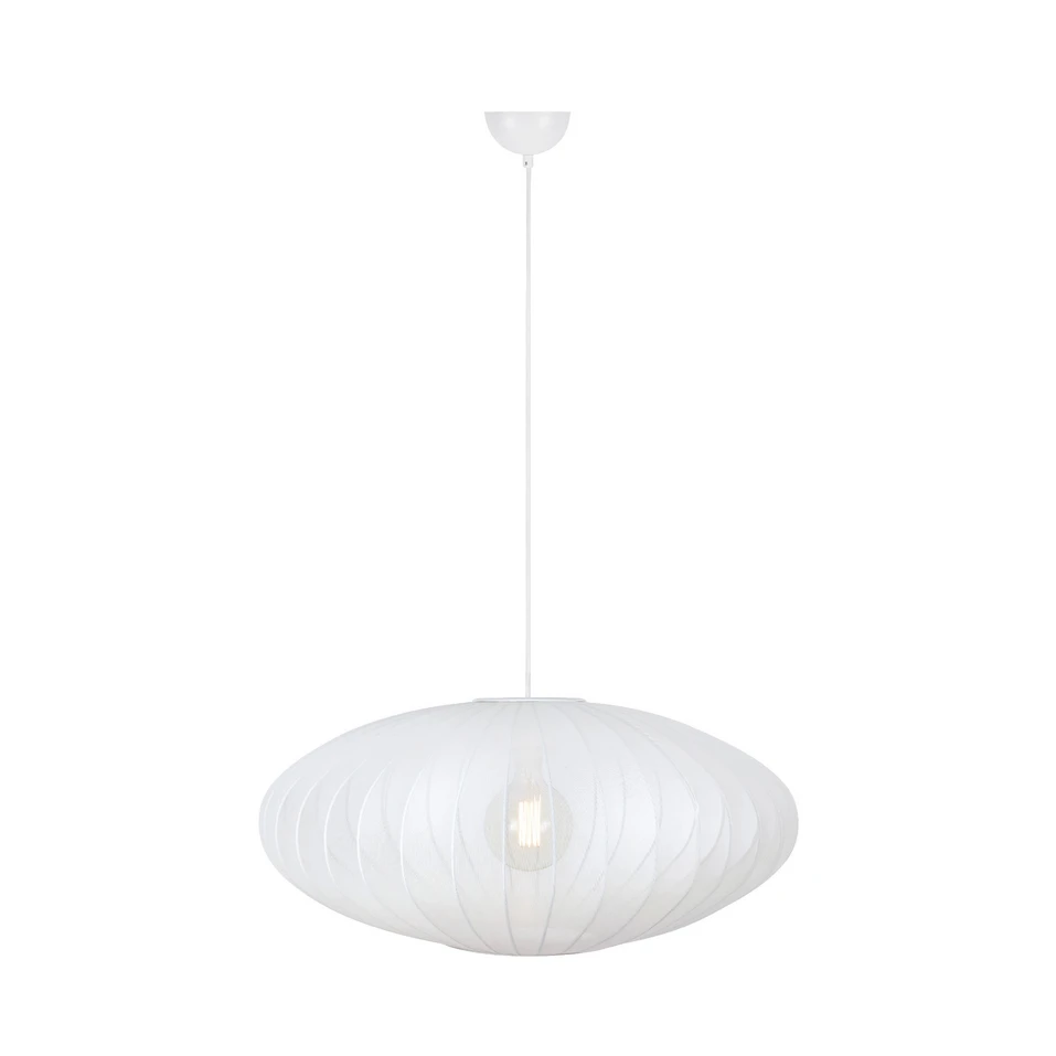 Florence Suspension Ø75 White est une lampe qui permet d'obtenir un grand effet avec peu de moyens. La lampe est dotée d'un volumineux abat-jour en nylon tissé serré, tendu sur des entretoises métalliques qui lui donnent sa forme caractéristique. Le matériau nylon crée un magnifique dégradé de couleurs sur l'Abat-jour lui-même, où la couleur est plus dense en haut et en bas mais forme une transparence au milieu, permettant de voir la source lumineuse à l'intérieur. Ainsi, lorsque l'on allume la lampe, la lumière s'échappe de tous les côtés pour donner un bel éclat à l'ensemble. Comme l'Abat-jour entoure la source lumineuse de tous les côtés, celle-ci n'est pas éblouissante, ce qui crée une belle source de lumière indirecte qui est presque directe et qui éclaire donc efficacement la pièce.