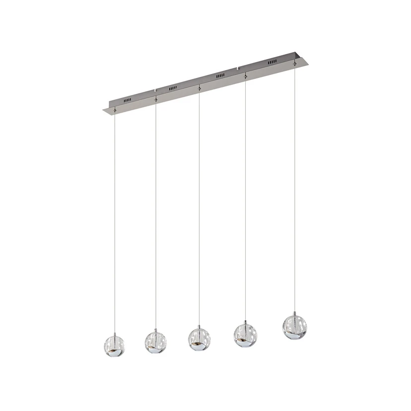 La lampe Hayley 5 Line Suspension Light Clear/Chrome est une lampe suspendue élégante et décorative caractérisée par ses magnifiques sources lumineuses en verre sphérique avec une structure de bulle spéciale qui donne à la lampe un aspect glamour. Les cinq sources lumineuses sont suspendues côte à côte sur un support rectangulaire et sont donc idéales au-dessus de la table à manger, de l'îlot de cuisine ou d'autres surfaces.