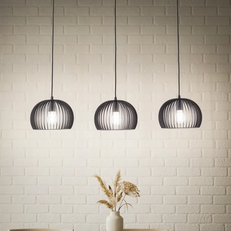 La lampe Suspensions Jusra 3 noir attire immédiatement le regard avec ses abats-jours en forme de cage qui attirent l'attention. Ceux-ci se composent de lamelles de métal peintes en noir, disposées en un dôme volumineux autour de la source lumineuse. Comme la source lumineuse est visible, elle constitue la pièce maîtresse lumineuse du design de la Lampe. Il est donc judicieux d'utiliser une ampoule à filament ou d'autres modèles décoratifs qui soutiennent l'aspect général.